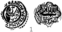 9. Вариант 1. Л. с. Поясное изображение человека влево; перед ним сверху свешивается раскрытая пасть змея с высунутым длинным изогнутым языком, за который человек его держит; вокруг между двумя линейными ободками круговая надпись: КНЯЗЬ ВЕЛИКИДМИТРИ. Трижды по 2-3 буквы соединены в лигатуру. Первое слово отделено точкой.